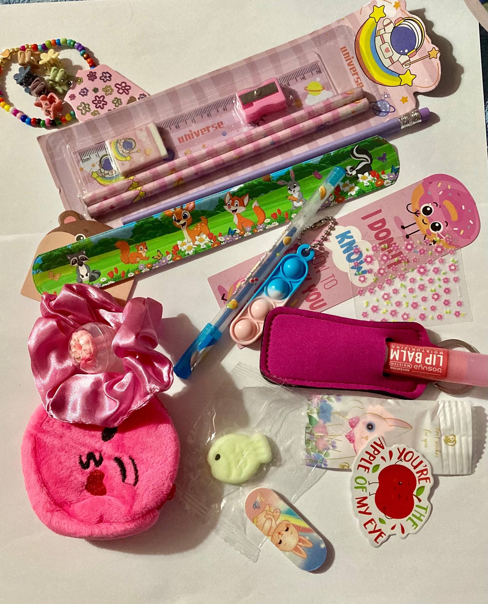 A mystery box containing 15 items, which could include - pencils, pens, erasers, bookmarks, stickers, rulers, key rings, bracelets, dress up rings, stationery set, nail files, nail stickers, mini hair claw, hair scrunchie, coin purse, mini squishies, scratch art, sticky notes, note books, lip balm, lip balm holder, 3D puzzles, rainbow pencil, rainbow gel pens, mini torch’s, paper glasses, face sticker art, pencil tops, straws and straw caps.